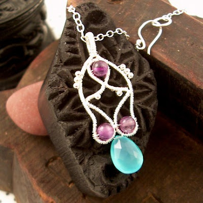 I have been doing some interesting things with dead soft wire in the last few weeks and I am pleased the results. I love the way the wire cages frame the beads and give them an interesting dimension. I used carnelian and lampwork beads for the silver necklace and earrings. The bangle is made with copper and silver wire that I hammered and adorned with fresh water pearls and Hill Tribe pure silver beads. The necklace and bangle bracelet are for sale in my esty shop . The earrings have been sold, but I am more than willing to do a custom design. All my jewelry is one of a kind so if you like the earrings, yours will be unique.